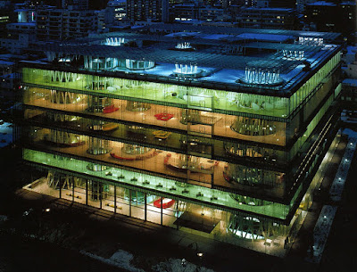 - Toyo Ito tarafından tasarlanan ve 2001 yılında açılan çok amaçlı bina, diaphanous cam paneller ve metal kaburgalarla kaplıdır. Kütüphanenin en önemli özelliklerinden birisi çevresindeki ağaçlarla uyumu ve sütunların yanından bina boyunca akan bitkilerdir.